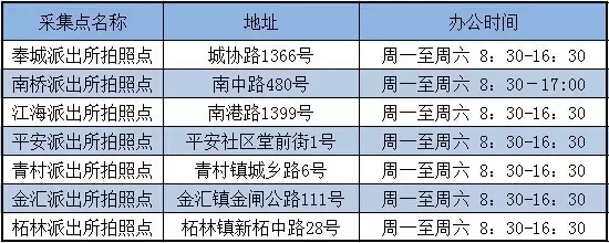 3、街道(镇)社区事务受理服务中心拍照点7个(工作时间周一至周日,上午8:00-11:00、下午13:00-16:00,国定节假日除外)(奉贤街道(镇)社区事务受理服务中心暂无拍照点)